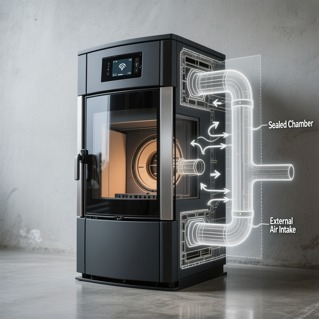 Cucina a pellet 12 kW con camera di combustione ermetica. Prende aria dall’esterno senza consumare ossigeno all’interno. Ideale per case passive, case ad alta efficienza o spazi ermetici.